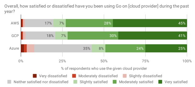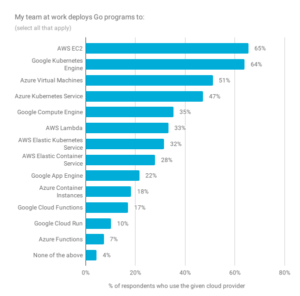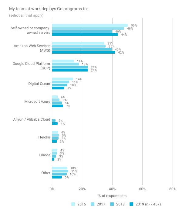 Go 在设计时就考虑了现代的分布式计算,我们希望继续改善开发人员使用 Go 构建云服务的体验。今年,我们扩展了有关云开发的问题,以更好地了解受访者与云提供商的合作方式,他们对当前开发人员体验的满意程度以及可以改进的地方。如前所述,2018 年的某些结果似乎有异常,例如自有服务器的意外低结果以及 GCP 部署的意外高结果。