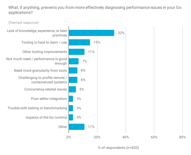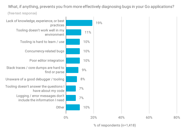 用任何一种语言来诊断故障和性能问题都可能具有挑战性。受访者告诉我们,这两个方面的最大挑战不是 Go 的实施或工具所特有的,而是一个更根本的问题:自我报告知识的缺乏,经验或最佳实践。我们希望在今年晚些时候通过文档和其他教育材料来帮助解决这些知识缺失。其他主要问题的确涉及工具,尤其是在学习/使用 Go 的调试和概要分析(profiling)工具时,在成本/收益方面存在不利的权衡取舍,以及使工具在各种环境中工作的挑战(例如,在容器中进行调试或从生产中获取性能概况)。