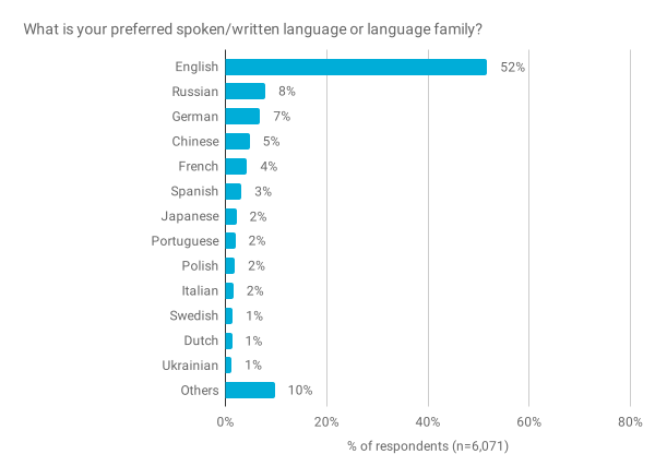 由于更新了 Google-wide 的隐私权准则,我们不再能够询问受访者居住的国家/地区。相反,我们询问了首选的口语/书面语言,以此作为 Go 语言在全球范围内的粗略用法,其好处是为潜在的本地化工作提供了数据。