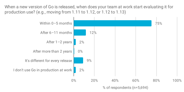 我们还发现,有 75% 的受访者评估了当前的 Go 版本以供生产使用,另有 12% 的受访者等待下一个发布周期。这表明大多数 Go 开发人员正在使用(或至少尝试使用)当前或以前的稳定版本,从而突出了平台即服务提供商快速支持 Go 的新稳定版本的重要性。