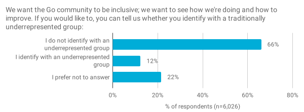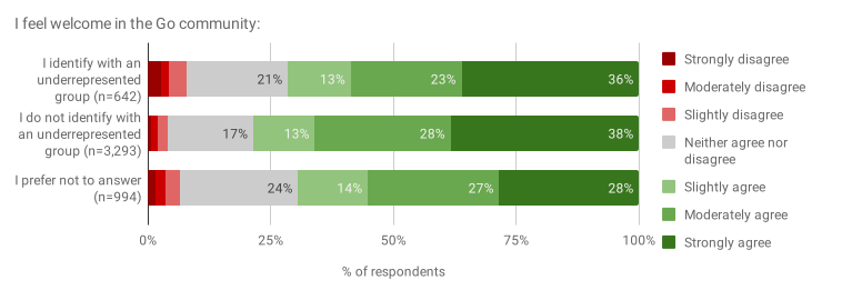 识别出代表性不足的群体或宁愿不回答该问题的受访者,与不认同代表性不足的群体的受访者相比,“在 Go 社区中我感到受欢迎”这一说法的异议率更高(8% vs 4%)。这表明我们持续开展宣传工作的重要性。