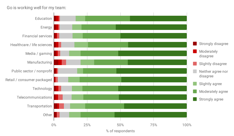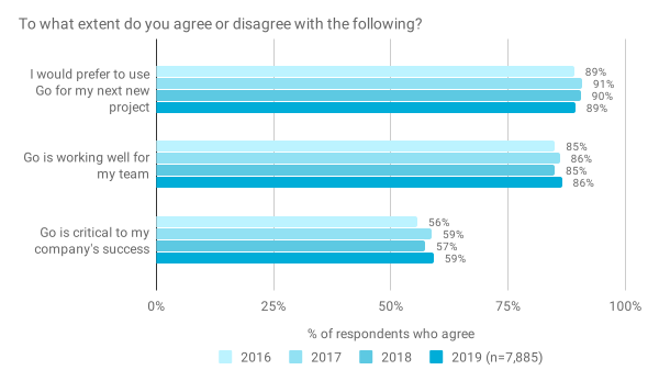 大部分受访者都认为 Go 在他们的团队中表现良好(86%),并且他们希望将其用于下一个项目(89%)。我们还发现,超过一半的受访者(59%)认为 Go 对他们公司的成功至关重要。自 2016 年以来,所有这些指标一直保持稳定。