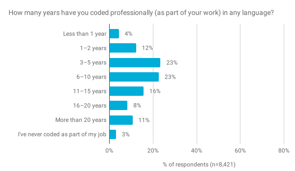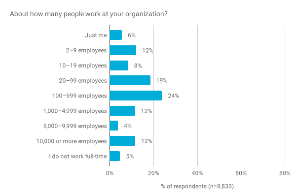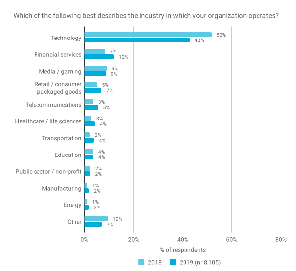 去年,我们询问了受访者从事哪些行业,发现大多数人报告曾在软件,互联网或网络服务公司工作。今年看来,受访者代表了更广泛的行业。但是,我们还简化了行业清单,以减少潜在重叠的类别(例如,2018年将“软件”和“互联网/网络服务”的单独类别合并为 2019 年的“技术”)。因此,严格来说,这并不是苹果与苹果之间的比较。例如,简化类别列表的一种效果可能是减少“软件”类别的使用。