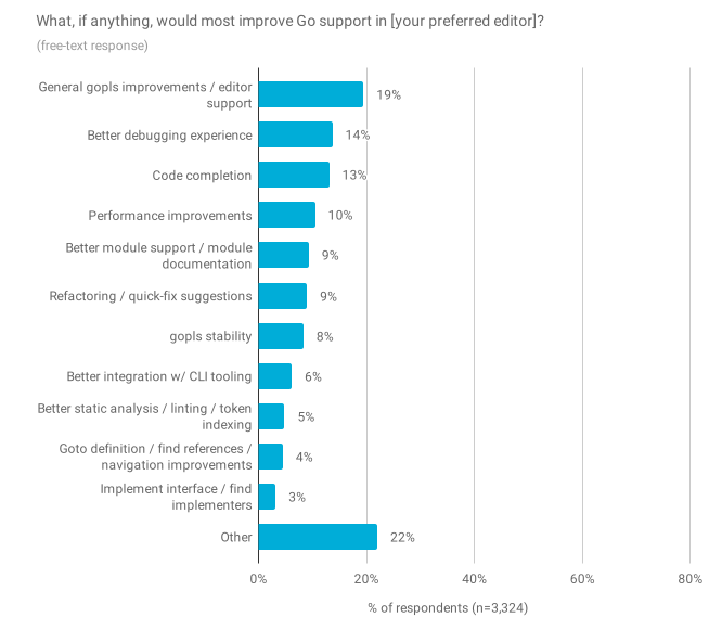 最后,当我们问到在受访者的编辑环境中最能改善 Go 支持的内容时,最常见的回答是对语言服务器的总体改进或更好的支持(gopls,19%)。这是预料之中的,因为 gopls 替代了大约 80 种现存的工具,并且仍处于测试阶段。当受访者更具体地说明他们希望获得的改进时,他们最有可能报告调试经验(14%)和更快或更可靠的代码完成率(13%)。许多参与者还明确提到使用 gopls(8%)时需要频繁重新启动 VS Code 的需求;自从这项调查在实地进行以来(2019 年 11 月下旬至 12 月初),许多 gopls 改进措施已经着手,这仍然是团队的重点工作领域。