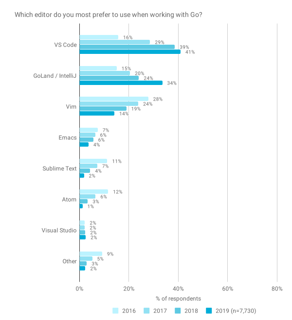 其他所有编辑器使用者的数量都有所减少。但这并不意味着,他们根本就不使用这些编辑器,当然也不表明,他们使用这个编辑器只是因为写 Go 代码(polaris 注:更多可能是用它编写其他代码,习惯了,因此也用来写 Go)。
