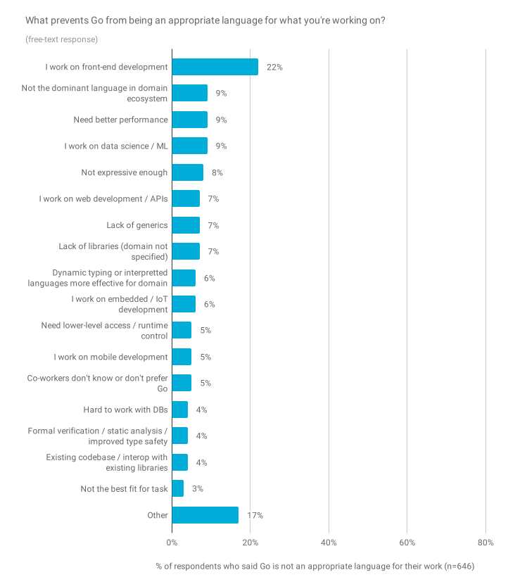 表示使用 Go 语言不是“合适的语言”的受访者有多种原因和用例。最常见的是他们从事某种形式的前端开发(22%),例如用于 Web,桌面或移动的 GUI。另一个普遍的回答是,受访者说他们在一个已经占主导地位的语言(9%)的领域中工作,这使得使用其他语言成为一个挑战。一些受访者还告诉我们他们所指的是哪个域(或简单地提到一种而不提到另一种更常见的语言),我们通过下面的“I work on [domain]”行显示。受访者提到的另一个首要原因是需要更好的性能(9%),特别是对于实时计算。