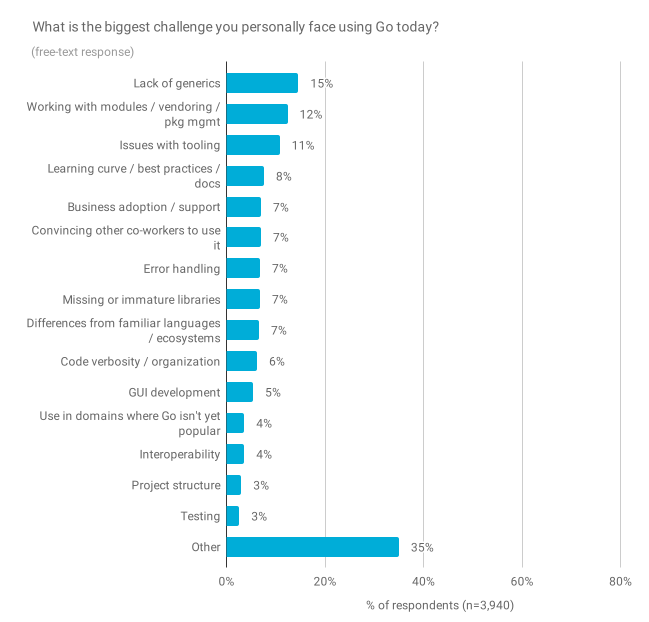 最大挑战与去年基本保持一致。Go 缺乏泛型和模块/软件包管理仍然是最主要的问题(分别占响应的 15% 和 12%),并且强调工具问题的受访者比例有所增加。这些数字与上面的图表不同,因为这个问题是所有受访者都提出的,无论他们说不使用 Go 最大的阻碍是什么。以上这三个都是今年 Go 团队关注的领域,我们希望在未来几个月中能极大地改善开发人员的体验,尤其是在模块,工具和入门经验方面。