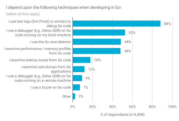 除了受访者正在构建的内容之外,我们还询问了他们使用的一些开发技术。绝大多数受访者表示,他们依赖文本日志进行调试(88%),对此他们的回复是因为替代工具难以有效使用。但是,本地调试工具(例如,使用 Delve),性能分析和使用竞争检测器进行测试并不少见,约有 50% 的受访者依赖于其中至少一种技术。