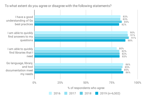 看看在 Go 生态系统中解决问题的情绪,我们看到了类似的结果。很大比例的受访者同意每种说法(82%–88%),并且在过去四年中,这些比率在很大程度上保持稳定。