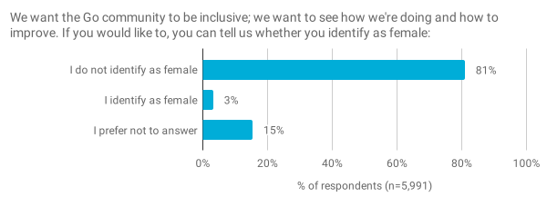 我们发现 12% 的受访者认同传统上代表性不足的群体(例如种族,性别等),而 3% 的认同者为女性。(这个问题应该说的是“woman”而不是“female”。该错误已在我们的 2020 年调查草案中得到纠正,对此我们深表歉意。)我们强烈怀疑这 3% 的人会导致低估了 Go 社区中的女性。例如,我们知道美国的女性软件开发人员对 StackOverflow 开发人员调查的回应率大约是根据美国就业数据得出的预期值[4]的一半(11% vs 20%)。由于我们不知道美国的回应比例,因此无法准确地从这些数字中推断出实际比例可能高于 3%。此外,GDPR 要求我们改变对敏感信息的询问方式,其中包括性别和传统上代表性不足的群体。不幸的是,这些变化使我们无法将这些数字与以前的年份进行有效比较。