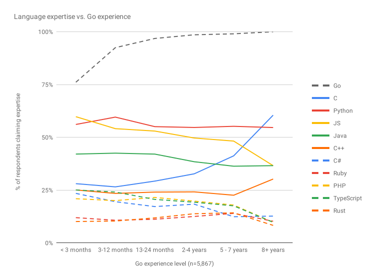 使用时间最长的受访者与新的 Go 开发人员的背景不同。这些 Go 老兵更有可能声称拥有 C/C++ 的专业知识,而不太可能声称具有 JavaScript,TypeScript 和 PHP 的专业知识。有一点需要提醒的是,这是自我报告的“专业知识”。将其视为“熟悉”可能会更有用。不管他们使用 Go 有多长时间,Python 似乎都是大多数受访者熟悉的语言(不是 Go)。