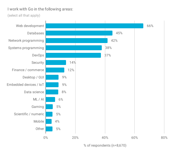 另外一个相关的问题,询问了受访者使用 Go 的更大领域。到目前为止,最常见的领域是 Web 开发(66%),其他常见的领域包括数据库(45%),网络编程(42%),系统编程(38%)和 DevOps 任务(37%)。