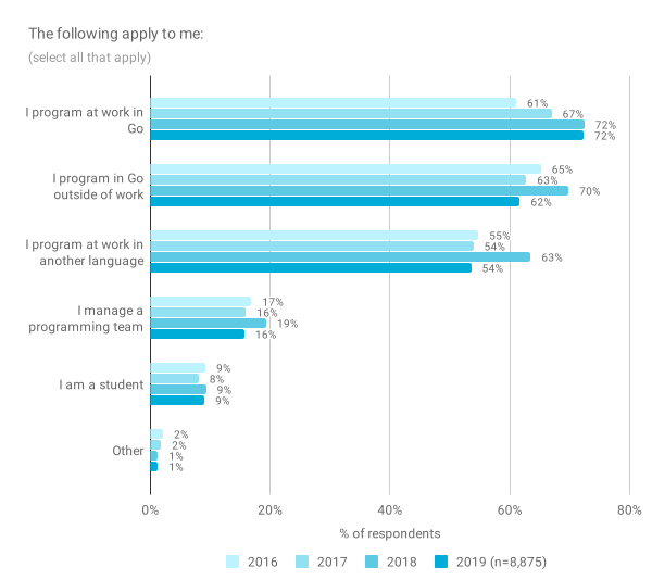 如您在下表中所见,2018 年我们看到了这些数字的激增,但这一增长在今年消失了。这似乎表明 2018 年回答调查的受众与其他三年有很显著的不同。在这种情况下,他们更有可能在工作外使用 Go 并在工作时使用其他语言,但是我们在多个调查问题中看到了类似的异常值。