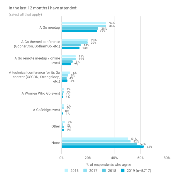 上一张图表的长尾巴突出显示了各种不同的来源(几乎所有这些来源都是社区驱动的)和方式,受访者在使用 Go 进行开发时要克服挑战。确实,对于许多 Gophers 来说,这可能是他们与更大社区互动的主要点之一:随着社区的扩展,我们看到越来越多的未参加 Go 相关活动的受访者比例越来越高。在 2019 年,这一比例几乎达到了三分之二的受访者(62%)。