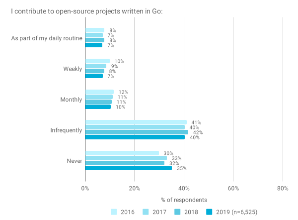 Go 是一个成功的开源项目,但这并不意味着使用它的开发人员也正在编写免费或开源软件。与往年一样,我们发现大多数受访者并不是 Go 开源项目的频繁贡献者,有 75% 的受访者表示他们“很少”或“从不”这样做。随着 Go 社区的扩展,我们发现从未为 Go 开源项目做出过贡献的受访者所占的比例正在缓慢上升。