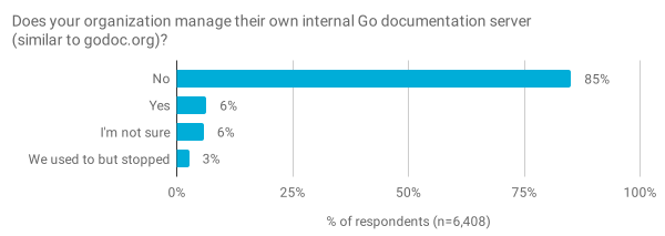 今年,我们添加了一个有关内部 Go 文档工具(例如 gddo[2])的问题。少数受访者(6%)表示他们的组织运行自己的 Go 文档服务器,尽管当我们查看大型组织(至少有 5,000 名员工)的受访者时,这一比例几乎翻了一番(达到11%)。对受访者的后续询问表示他们的组织已停止运行其自己的文档服务器,这表明关闭该服务器的主要原因是,人们认为相比最初搭建该服务器所需的工作量以及维护工作量(38%),它的收益较低(23%)。