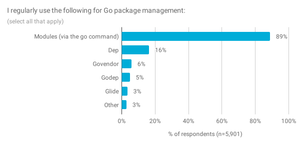 关于软件包管理,我们发现绝大多数受访者已采用 Go 的模块(89%)。对于开发人员来说,这是一个巨大的转变,几乎整个社区似乎都在同时经历。