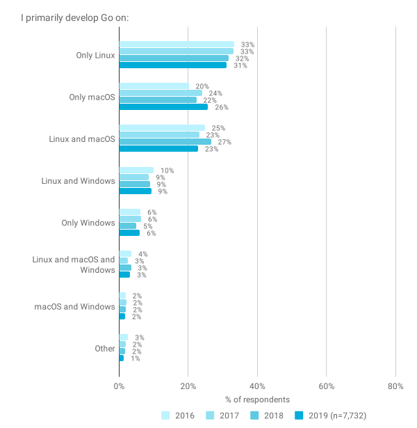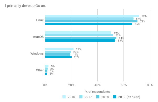 与往年一样,绝大多数被调查者表示在 Linux 和 macOS 系统上使用 Go。这是我们的受访者与 StackOverflow 的 2019 年结果之间存在很大差异的一个领域:在我们的调查中,只有 20% 的受访者使用 Windows 作为主要开发平台,而 StackOverflow 是 45%。Linux 的使用率为 66%,macOS 的使用率为 53%,这两者都远远高于 StackOverflow 的受众,后者分别报告了 25% 和 30%。