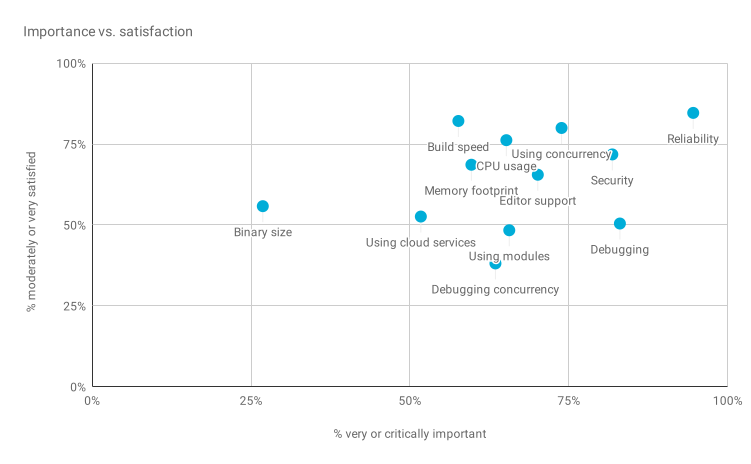 今年,我们对各个行业的满意度进行了更细微的考察,以建立基准。总体而言,无论行业如何,受访者都对在工作中使用 Go 持积极态度。我们确实在一些领域(尤其是制造业)中看到了不满的微小变化,我们计划通过后续研究进行调查。同样,我们询问了对 Go 开发各个方面的满意度以及重要性。将这些措施结合在一起可以突出显示三个特别关注的主题:调试(包括调试并发),使用模块和使用云服务。大多数主题将这些主题中的每一个评为“非常”或“至关重要”,但与其他主题相比,满意度得分明显较低。